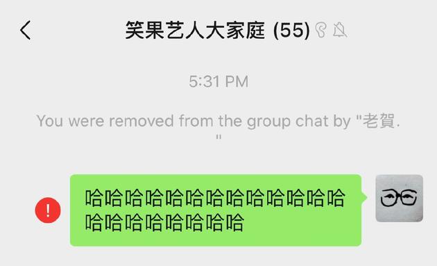 网易娱乐1月9日报道 此前,有网友爆料称池子和李诞不和,引发热议。1月9日晚,池子晒出一张聊天记录截图,截图显示,池子在笑果艺人大家庭的群聊中发了一条“哈哈哈”的讯息,却发现被笑果文化CEO贺晓曦移除了群聊,导致信息发送失败。池子发文表示:“朋友们,这就是脱口秀,笑果脱口秀”,并发了一长段“哈哈哈”,还调侃贺晓曦:“你挺有意思啊,你怕我哈哈是吗?”