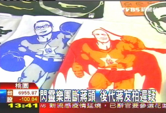 蒋介石、蒋经国的肖像印在T恤上,身体却是肌肉猛男、紧身衣加披风。图片来源:台湾TVBS