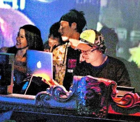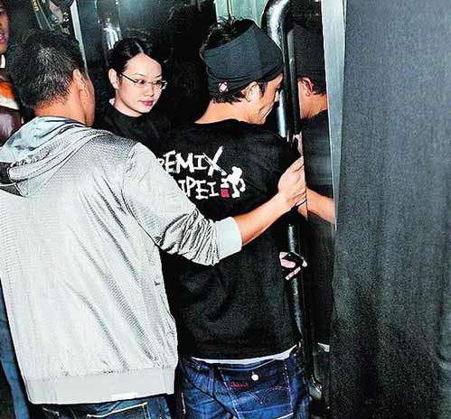 陈冠希(中)和DJ在台上放音乐,辣妹上台合照。(台湾“苹果日报”图)