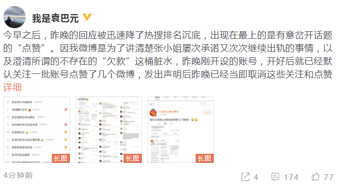 刚刚,袁巴元发文回应点赞事件,他称:“今早之后,昨晚的回应被迅速降了热搜排名沉底,出现在最上的是有意岔开话题的“点赞”。