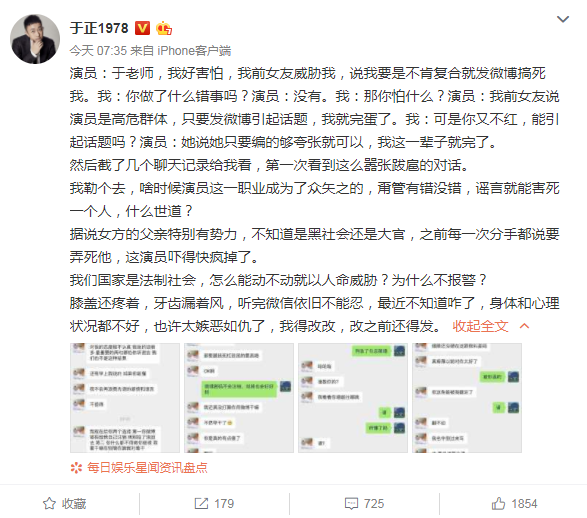 于正曝男艺人被前女友恐吓