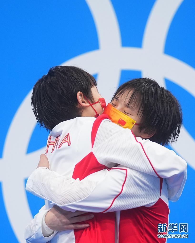 7月27日,中国选手陈芋汐(右)和张家齐在颁奖仪式上拥抱。
