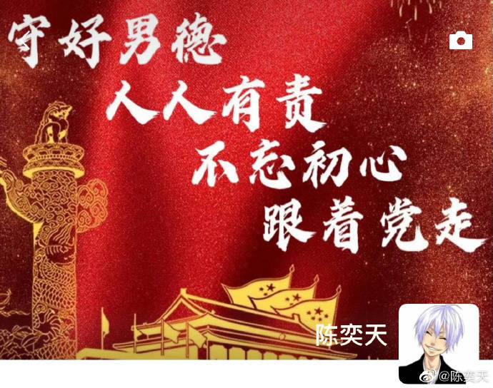 陈奕天分享了自己做的朋友圈封面,里面四行大句写着“守好男德,人人有责,不忘初心,跟着党走”。网友瞬间各种留言要封面图,太有意思了。