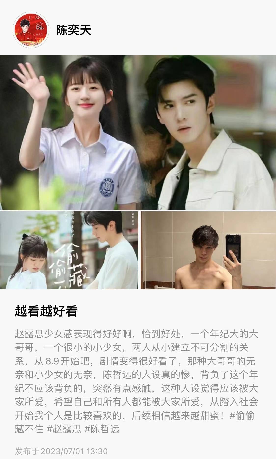这不,陈奕天终于发动态“越看越好看,赵露思少女感表现得好好啊,恰到好处,一个年纪大的大哥哥,一个很小的小少女,两人从小建立不可分割的关系,从8.9开始吧,剧情变得很好看了,那种大哥哥的无奈和小少女的无奈,陈哲远的人设真的惨,背负了这个年纪不应该背负的,突然有点感触,这种人设觉得应该被大家所爱,希望自己和所有人都能被大家所爱,从踏入社会开始我个人是比较喜欢的,后续相信越来越甜蜜!”。