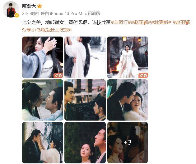陈奕天发文“七夕之美,檀郎谢女,鸳俦凤侣,连枝共冢#与凤行##赵丽颖##林更新# ”。配图与凤行赵丽颖林更新甜蜜图!