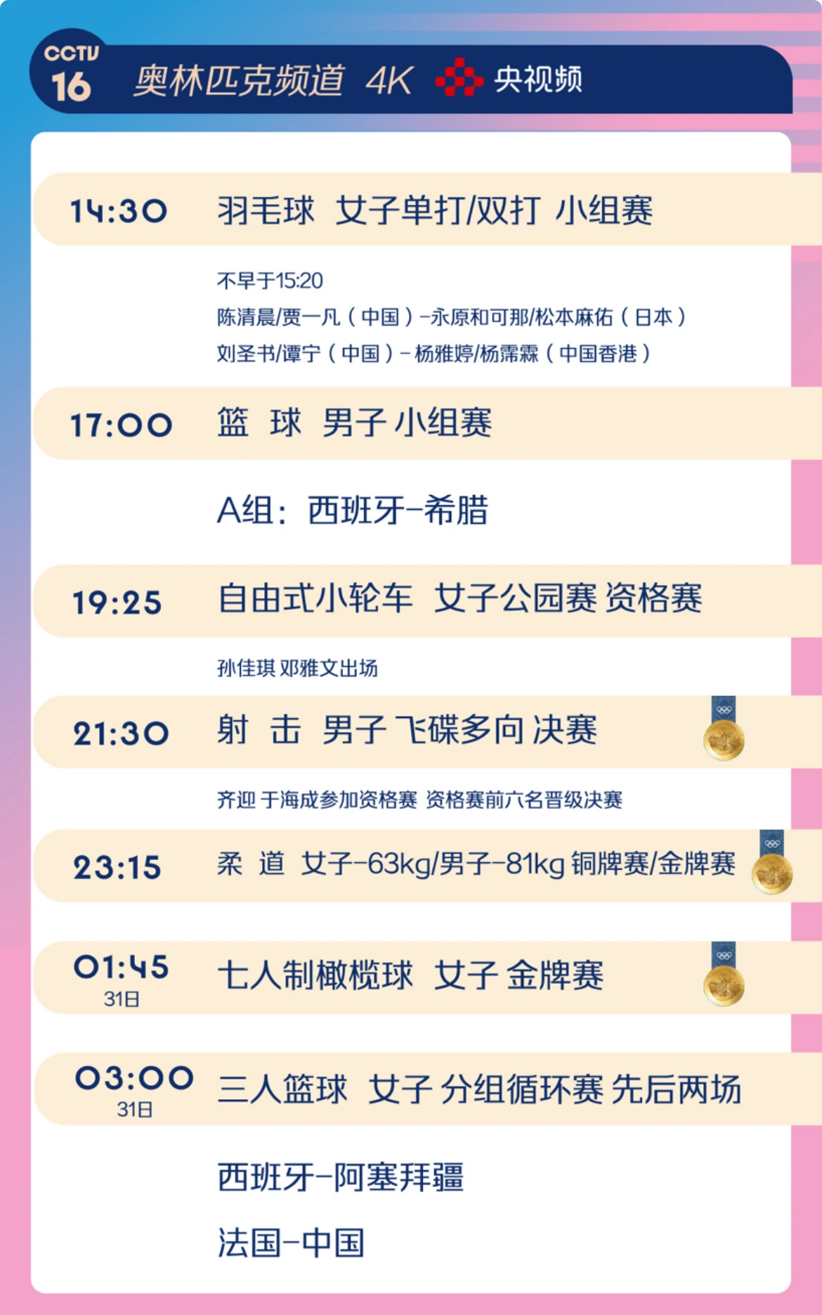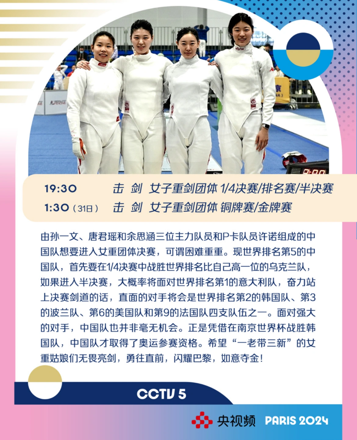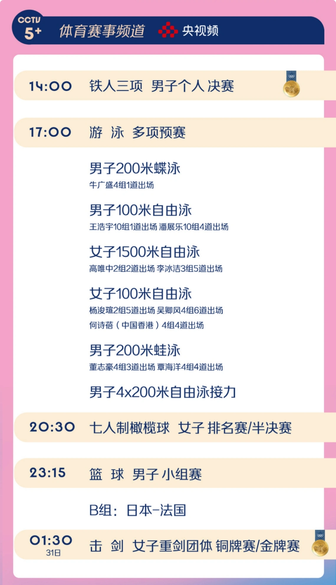 巴黎奥运会第四个比赛日将产生14枚金牌。中国乒乓球队将冲首金,体操、游泳等项目将对金牌发起冲击。